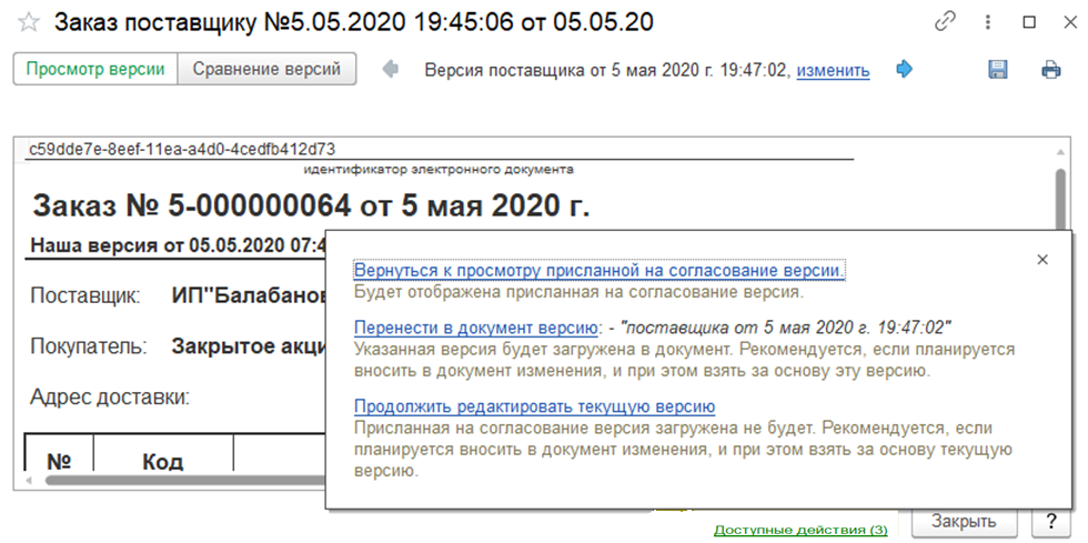 В режиме просмотра версии, в зависимости от того чья версия просматривается (наша или контрагента), могут быть доступны разные действия.