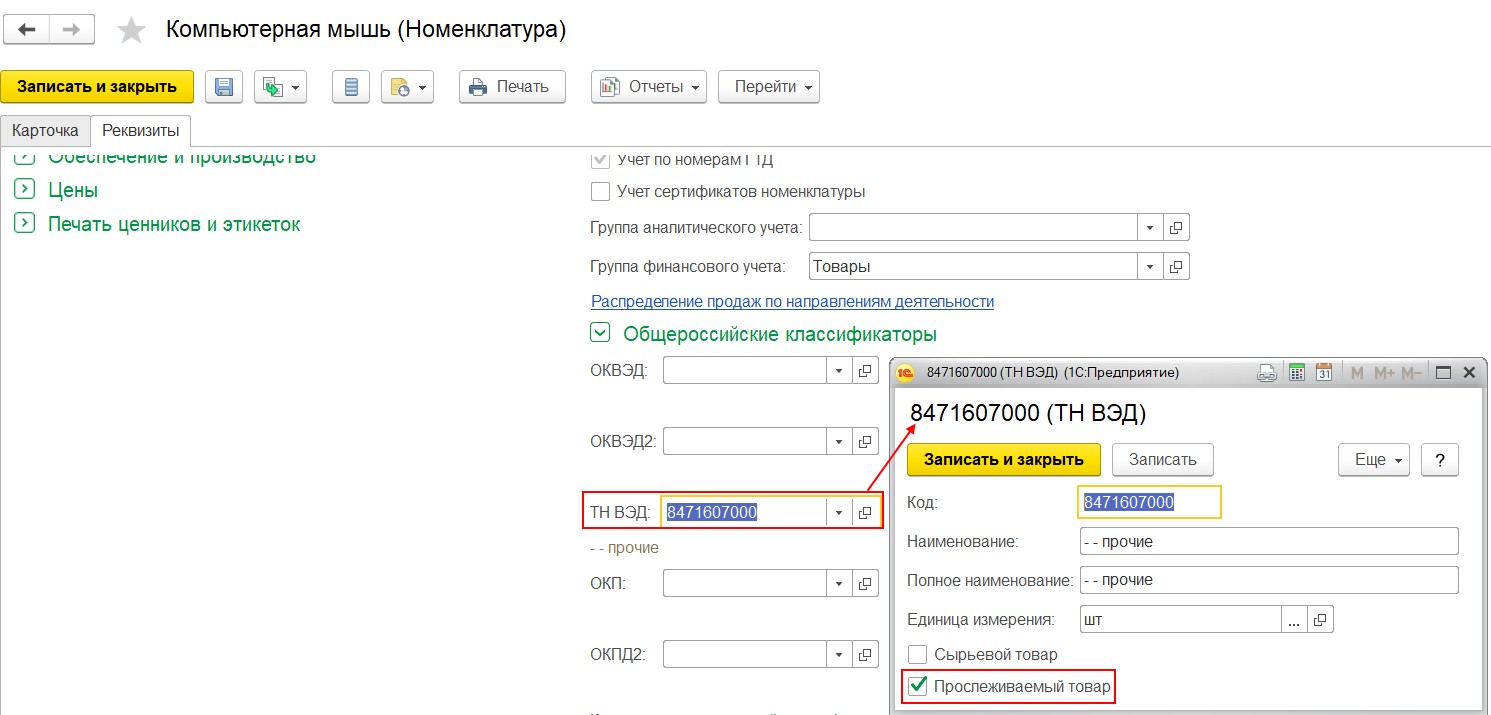 Если товар относиться к прослеживаемым импортным товарам, то в карточке номенклатуры указывается код ТН ВЭД с установленным признаком Прослеживаемй товар.