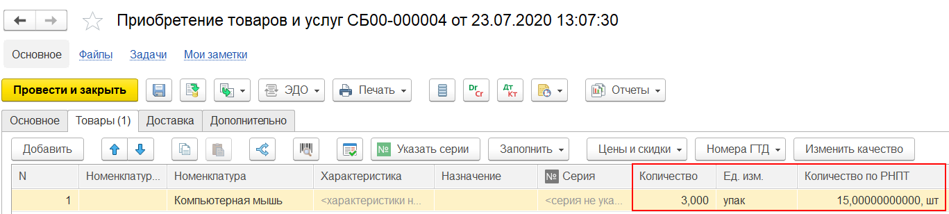 При учете прослеживаемых импортных товаров в двух единицах измерения в документах доступно поле Количество по РНПТ, количество в котором заполняется в единице измерения прослеживаемости ТН ВЭД.