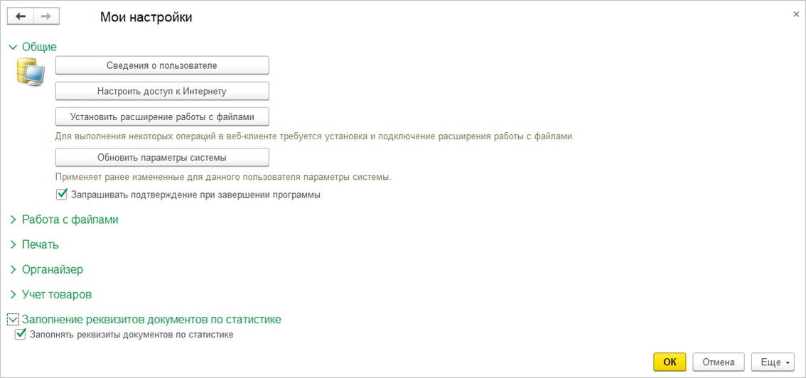 В персональные настройки пользователя (НСИ и администрирование – Сервис – Персональные настройки) добавлена возможность отключения заполнения реквизитов документов по данным статистики.