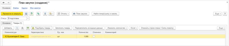 Система предлагает закупить 1 штуку 1С:Бухгалтерии, чтобы покрыть плановый дефицит продукции.