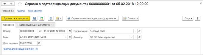 Для формирования формы Справки о подтверждающих документах необходимо внести требуемые данные на вкладках Основное и Подтверждающие документы, а также по ссылке Файлы для передачи в банк приложить электронные копии подтверждающих документов (счета, акты, накладные, ГТД, письма в банк и пр.).