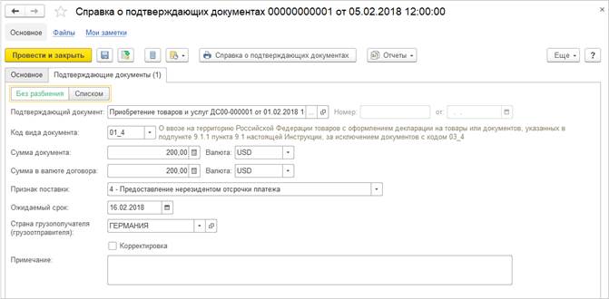 На вкладке Подтверждающие документы вносится: