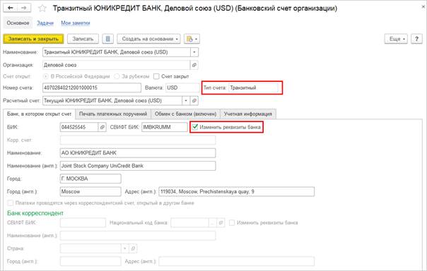 Добавление информации об имеющемся у организации транзитном счете в справочник НСИ и администрирование – НСИ – Банковские счета возможно как, непосредственно из самого справочника по команде Создать, так и из карточки расчетного (текущего) счета в иностранной валюте по ссылке Транзитный. Для заполнения реквизитов банка на английском языке требуется их редактирование в классификаторе НСИ и администрирование – См. также – Банки.