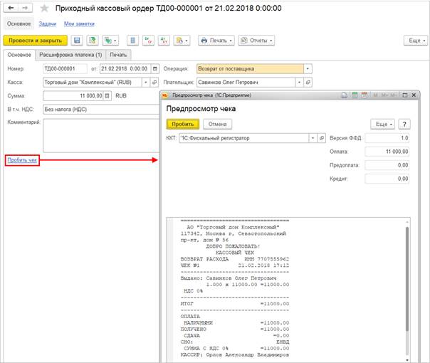 С этой целью реализована возможность пробивания кассового чека (гиперссылка Пробить чек, окно Предпросмотр чека) для следующих документов и хозяйственных операций:
