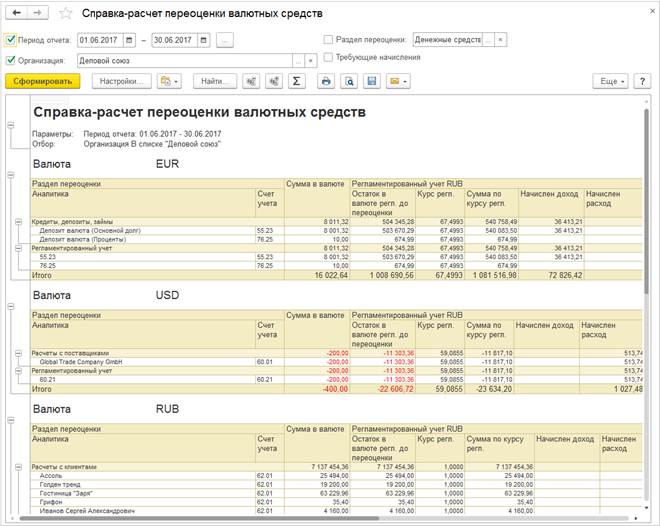 Для каждой используемой валюты по каждому разделу переоценки (переоцениваемый учетный регистр) в отчете отображается информация для регламентированного и управленческого учета по следующим показателям: