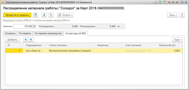 Списание расходов за счет ранее созданного резерва выполняется автоматически в рамках регламентной операции Распределение затрат и расчет себестоимости процедуры закрытия месяца. Списание расходов выполняется в пределах накопленного резерва. Непокрытая резервом часть расходов распределяется в соответствии с вариантом распределения, настроенным с использованием элементов списка Статьи расходов.