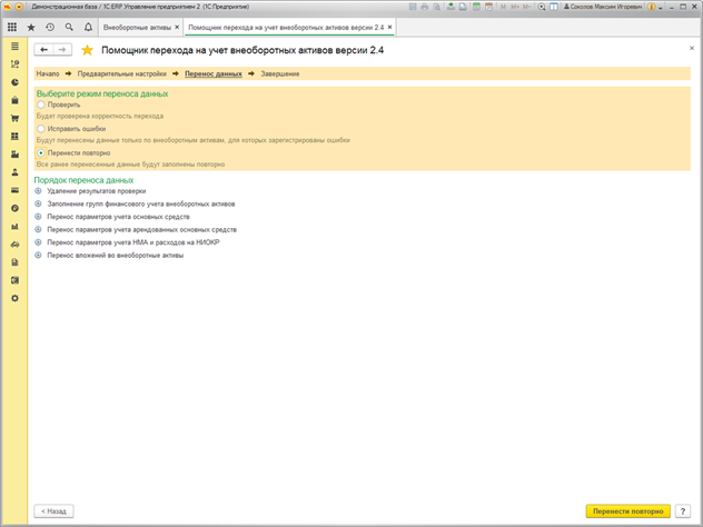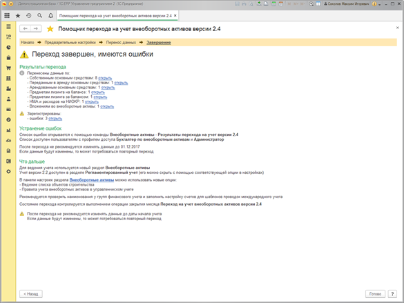 Параметры учета переносятся по данным регистров «как есть». Если по какой-то причине в регистрах с данными по ОС и НМА каких-то данных не хватает, то выполняется проверка и после переноса будет зарегистрирована ошибка.