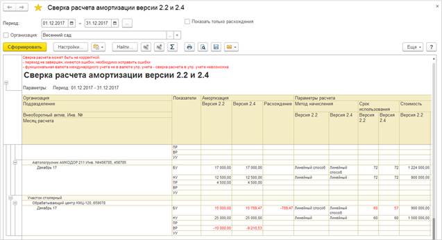 Отчет позволяет сверить расчет амортизации версии 2.2 с версией 2.4. Отчет создает документы расчета амортизации и сверяет полученные данные. Это дает возможность проанализировать успешность перехода с внеоборотных активов версии 2.2 на версию 2.4 на реальных данных, соотнося расчеты по активам в одном и другом варианте учетов на одних и тех же данных за одинаковый период.