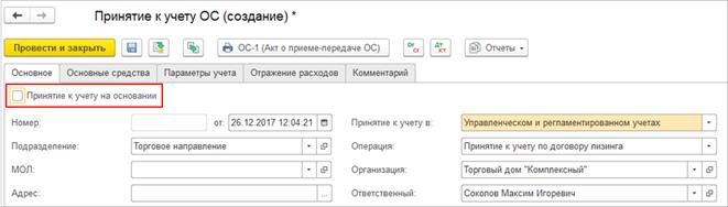 Выбор документа-основания становится доступен после установки флага Принятие к учету на основании.