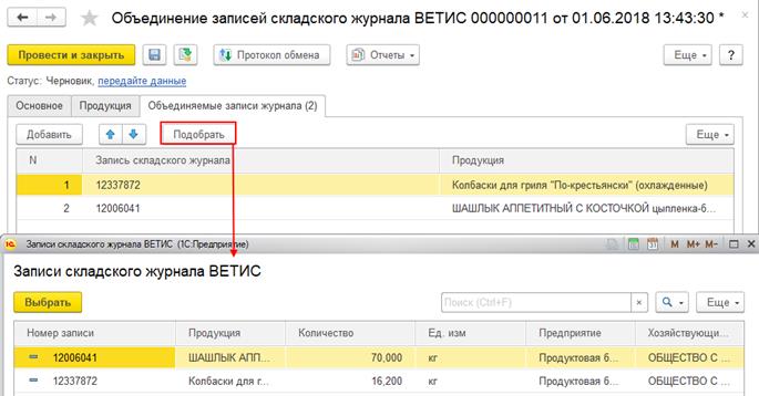 Указываются записи складского журнала ВЕТИС, которые будут объединены в одну запись складского журнала (команда Подобрать).