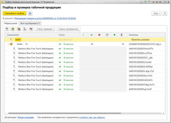 При реализации товаров, подлежащих обязательной маркировки (в табличной части товары указаны номенклатурные позиции, для которых в виде номенклатуры указан тип Табачная продукция) необходимо подобрать коды маркировки отгружаемой продукции в форме Подбор и проверка табачной продукции. Это форма открывается по ссылке Подбор и сканирование маркируемой продукции из документа: