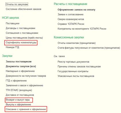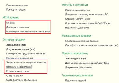 Разделы подсистемы Продажи синхронизированы с разделами подсистемы Закупки.