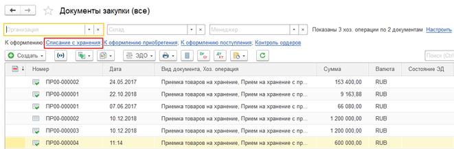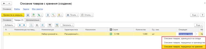 Для отражения в учете факта списания товаров, которые ранее были приняты на ответственное хранение, предусмотрен документ Списание товаров с хранения, использование которого позволяет оформить следующие операции: