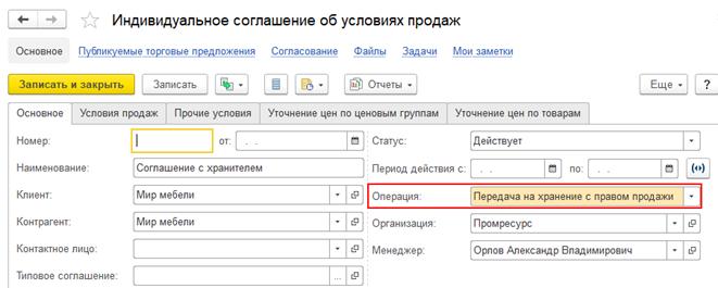 Для регистрации условий по передаче товаров на ответственное хранение используются соглашения с типом операции Передача на хранение с правом продажи (Продажи – НСИ продаж – Индивидуальные соглашения с клиентами/ CRM и маркетинг – НСИ продаж – Типовые соглашения с клиентами).