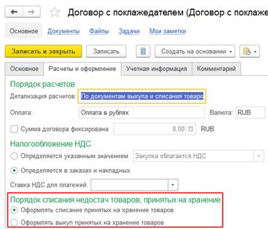 В договоре определяется порядок списания недостач товаров, принятых на хранение (на закладке Расчеты и оформление – Порядок списание недостач товаров, принятых на хранение):