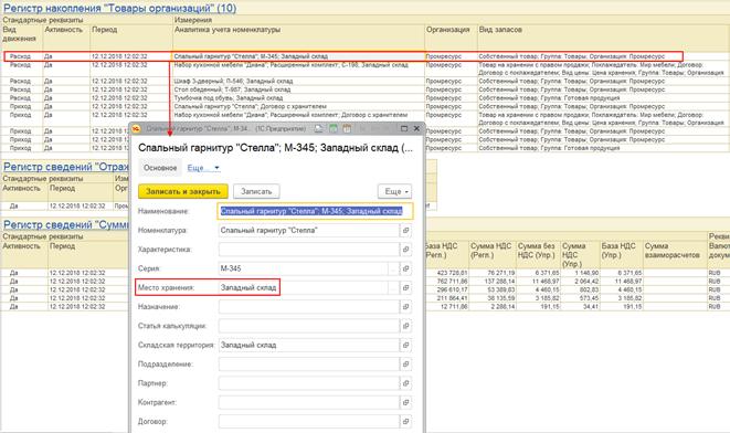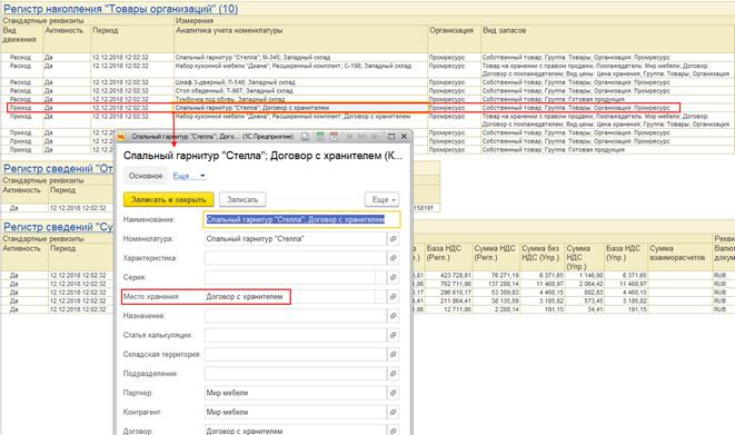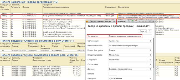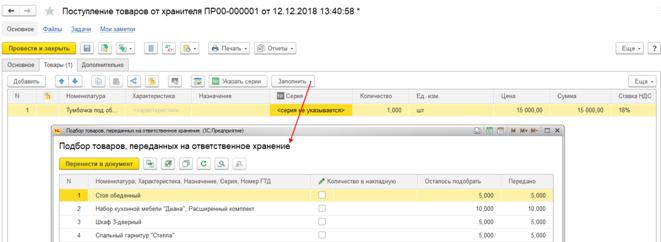 Если при подборе видов запасов в вышеуказанные документы подбираются товары, принятые на ответственное хранение и договором с поклажедателем предусмотрено оформление списания товаров (т.е. в договоре c типом взаимоотношений С поклажедателем, в рамках которого оформлена приемка товаров на ответственное хранение, задана настройка Оформлять списание, принятых на хранение товаров.