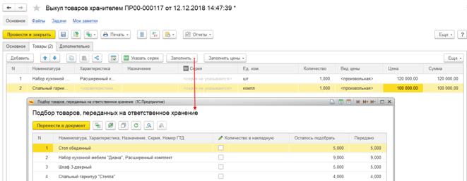 Выкуп товаров оформляется в рамках рабочего места Документы продажи (все) по команде Создать. Табличную часть документа можно заполнить с помощью формы Подбор товаров, переданных на хранение.