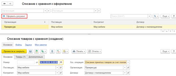 Шаг 3. Оформление документа Списание товаров с хранения.