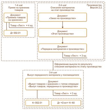 Пример оформления операции Выкуп товаров, переданных в производство, по результатам списания материалов в подразделение по этапу производства, представлен на схеме (при варианте «Управление производством (версия 2.2)»).