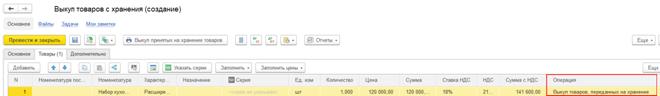 Пример оформления операции Выкуп товаров, переданных на хранение.