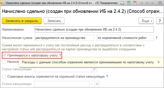 В карточке способа отражения зарплаты с распределением затрат на производство теперь можно установить флаг Принимаются к налоговому учету.