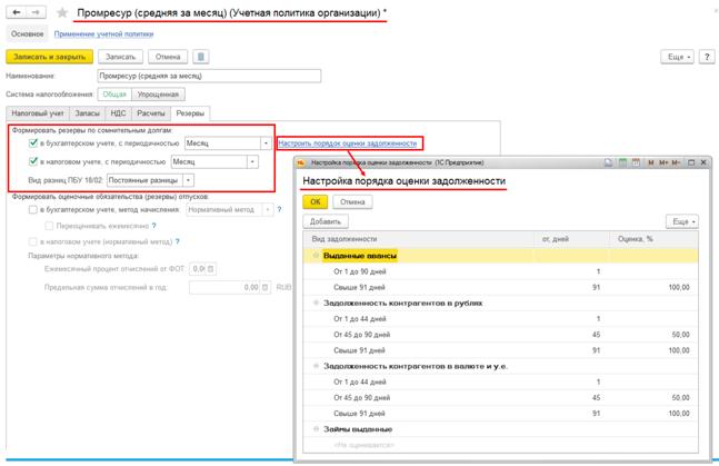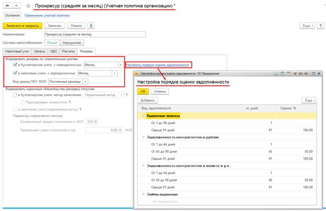 Доступные интервалы начисления резервов по сомнительным долгам определены для целей бухгалтерского учета: Месяц, Квартал, Год; для целей налогового учета: Месяц, Квартал.