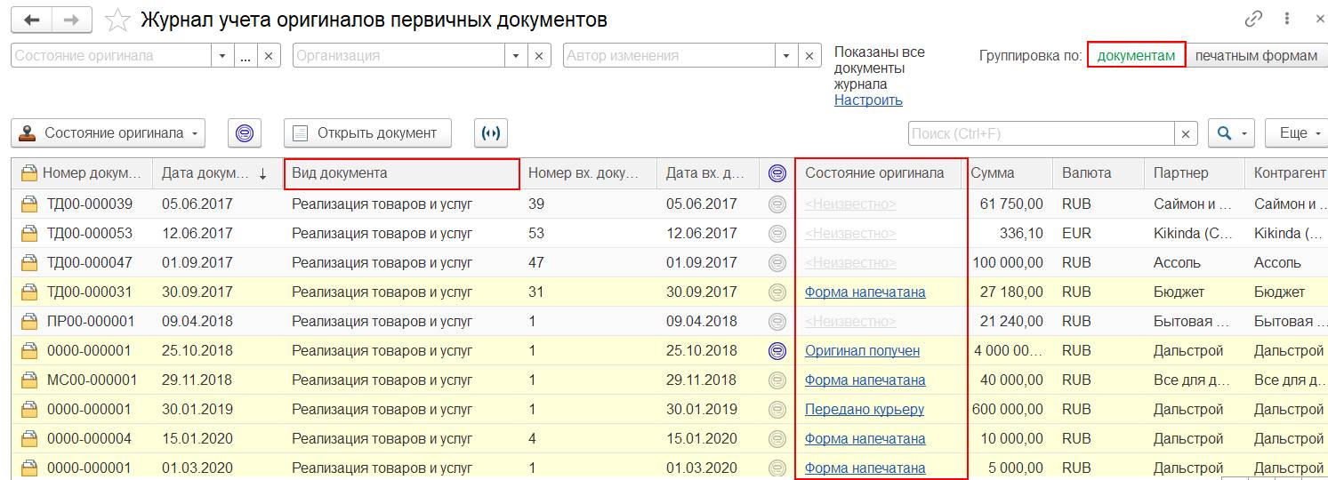 Вести учет наличия оригиналов первичных документов, контролировать состояния оригиналов первичных документов по общему состоянию документа можно в рамках журналов документов (например, в рамках журналов Документы продажи (все), Документы закупки (все)). Для такой возможности в журналы документов добавлены соответствующие инструменты: