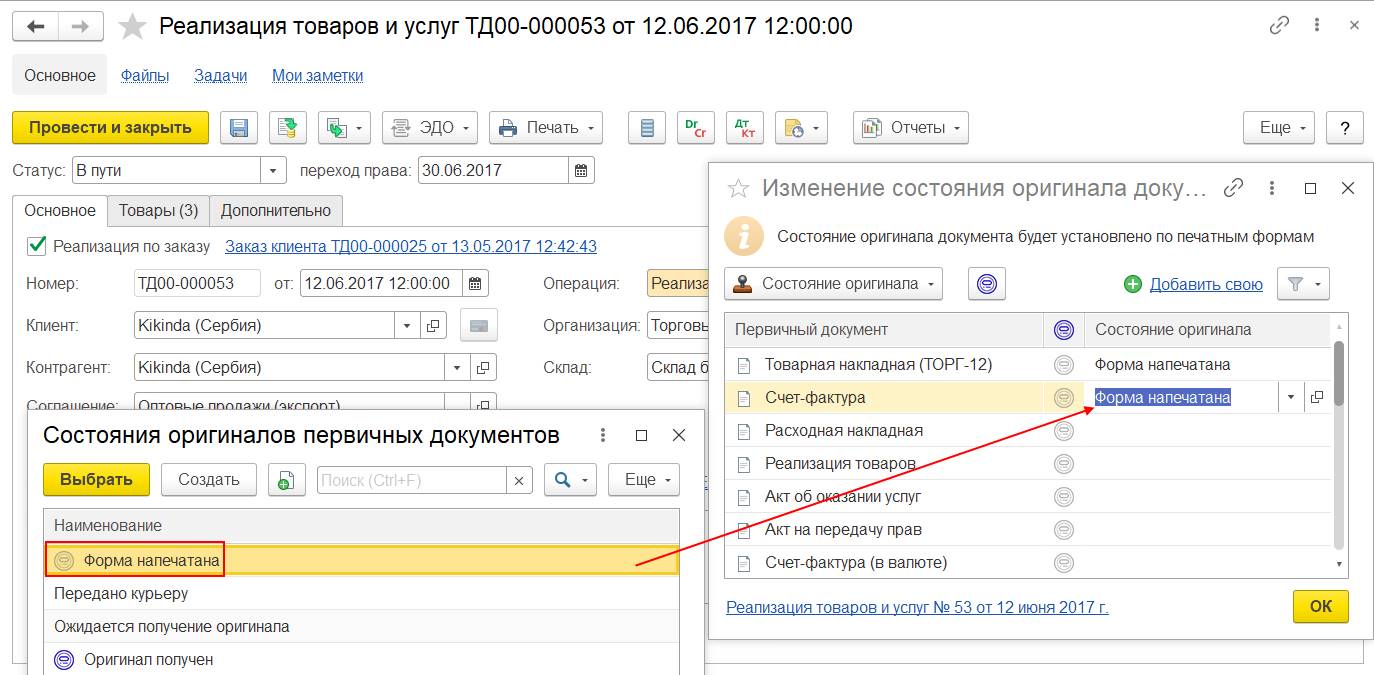Как только для каждой печатной формы будет установлено состояние Оригинал получен, то документ реализации товаров и услуг примет по умолчанию окончательное состояние Оригинал получен.