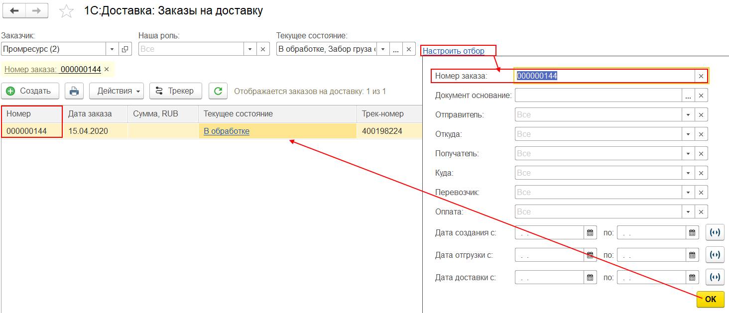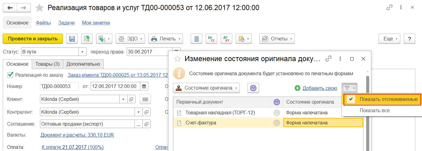 В форме изменения состояния оригинала документа можно установить отбор по отслеживаемым печатным формам (фильтр Показать отслеживаемые).