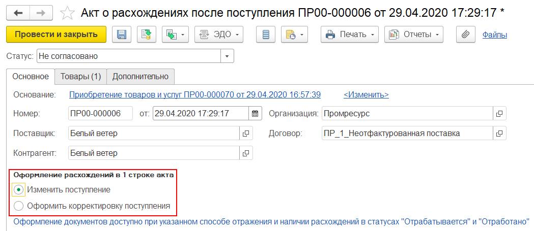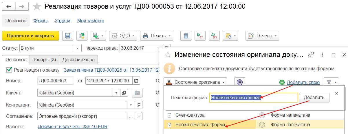Новому документу по умолчанию присваивается состояние «Состояние оригинала неизвестно». Изменить состояние оригинала (или печатных форм) первичного документа можно и из формы документа по соответствующей гиперссылке.