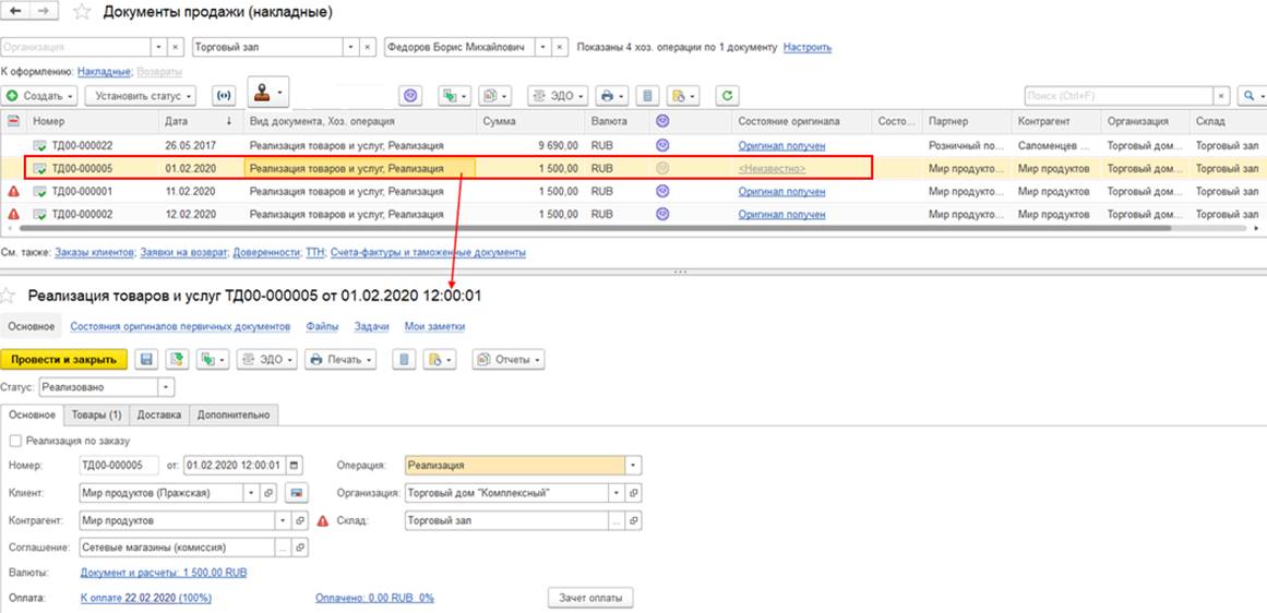 Также состояние оригинала первичного документа отображается непосредственно на форме документа реализации товаров и услуг.