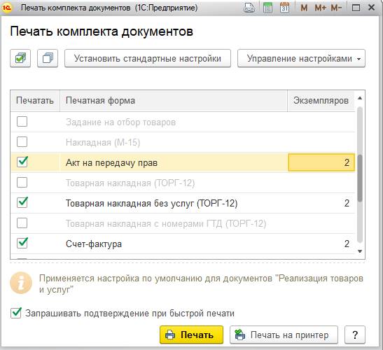 2. Запуск печати комплекта документов на принтер из формы документа реализации товаров и услуг (команда Печать – Комплект документов с настройками).