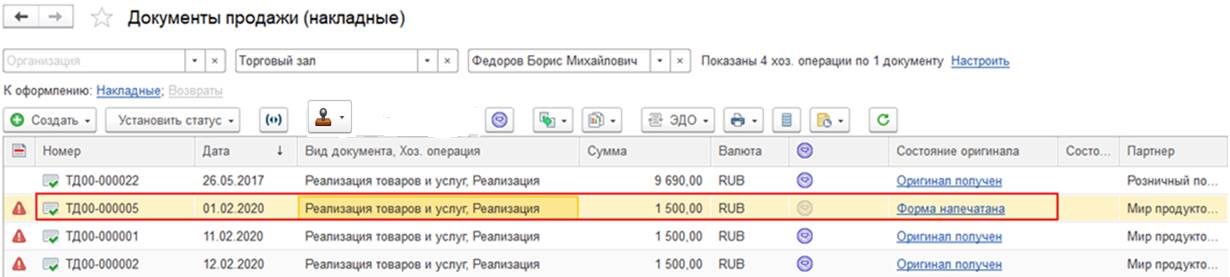 Также проконтролировать состояние оригинала первичного документа можно по общему состоянию документа Реализация товаров и услуг в рамках журнала документов продажи.