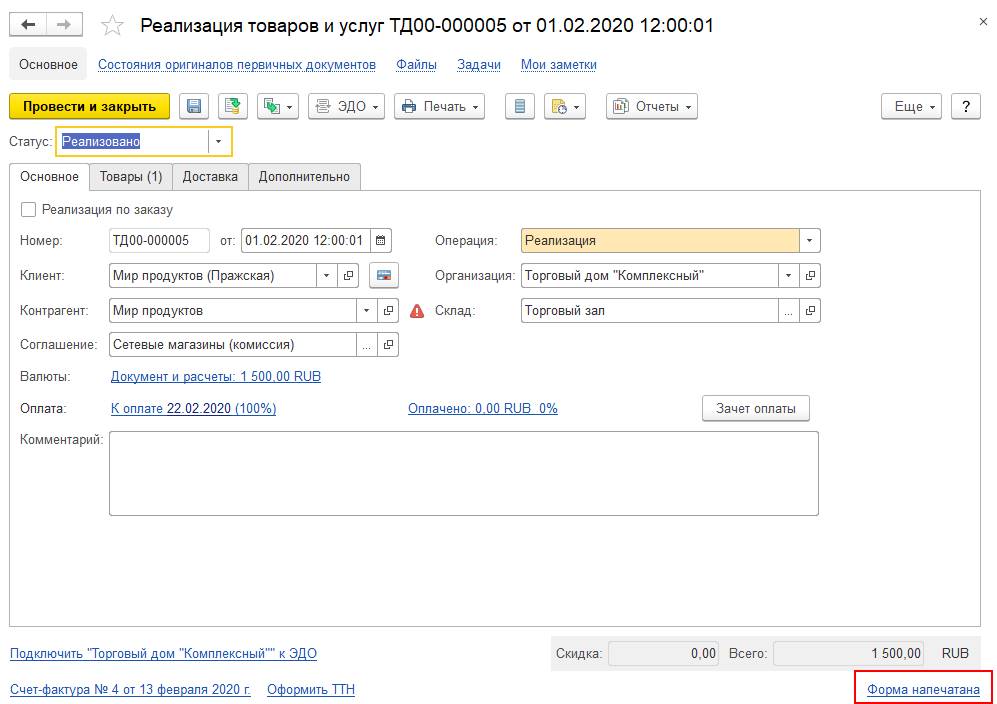 В журнале учета оригиналов первичных документов (в режиме группировки по печатным формам) для документа реализации и каждой его печатной формы можно увидеть текущее состояние оригинала Форма напечатана.