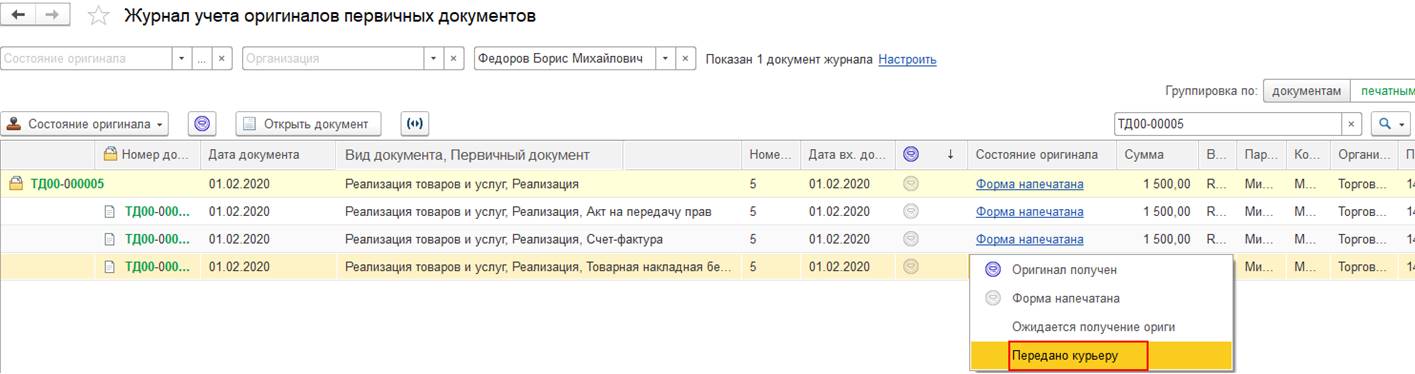 3. Передача оригинала (или печатных форм) первичного документа на подпись клиенту. На данном этапе можно изменить состояние оригинала (или печатных форм) на какое-либо промежуточное состояние. Например, на состояние оригинала Передано курьеру, которое было вручную добавлено в справочник Состояние оригиналов первичных документов.