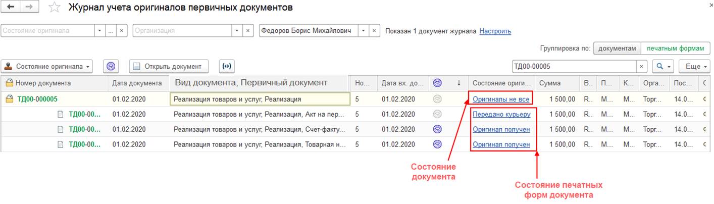 Общее состояние оригинала (или печатных форм) первичного документа реализации товаров и услуг можно просмотреть при группировке по печатным формам.