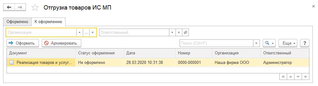 По этой ссылке открывается список документов к оформлению. Создать документ Отгрузка товаров ИС МП для указанного документа Реализации товаров и услуг можно по кнопке Оформить.