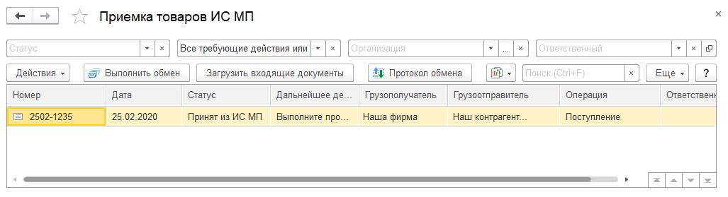 Документ создается в ИС МП и загружается в информационную базу автоматически после отражения продавцом документа. Загрузка может выполняться по расписанию обмена или по кнопке Загрузить входящие документы. Документ загружается в статусе Принят из ИС МП.