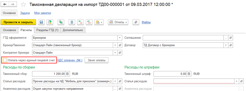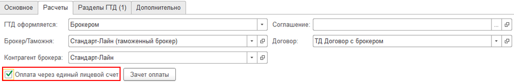 Для возможности оплаты через единый лицевой счет на форму документа Таможенная декларация на импорт добавляется реквизит Оплата через единый лицевой счет.