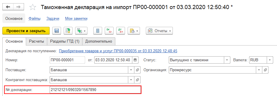При оформлении таможенной декларации на импорт поддерживается возможность генерации номеров ГТД без дополнения номером раздела или номером товара. Для такой возможности с закладки Основное документа таможенной декларации на импорт удален реквизит № декларации дополняется.