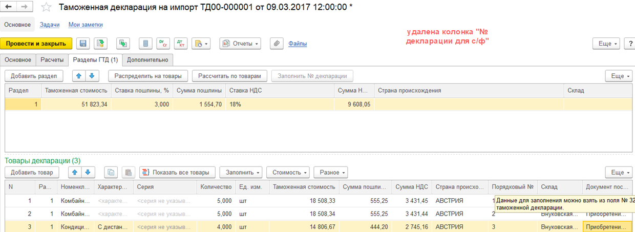 В табличных частях таможенной декларации на закладке Разделы ГТД удалены колонки с номером ГТД № декларации для с/ф.