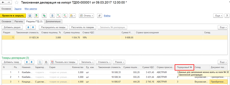 Если в декларации необходимо указать номер строки товара или номер раздела, соответствующий полю №32 таможенной декларации, то для такой возможности на закладке Разделы ГТД в табличную часть Товары декларации добавлено поле Порядковый №. По умолчанию поле не заполняется и не является обязательным к заполнению.