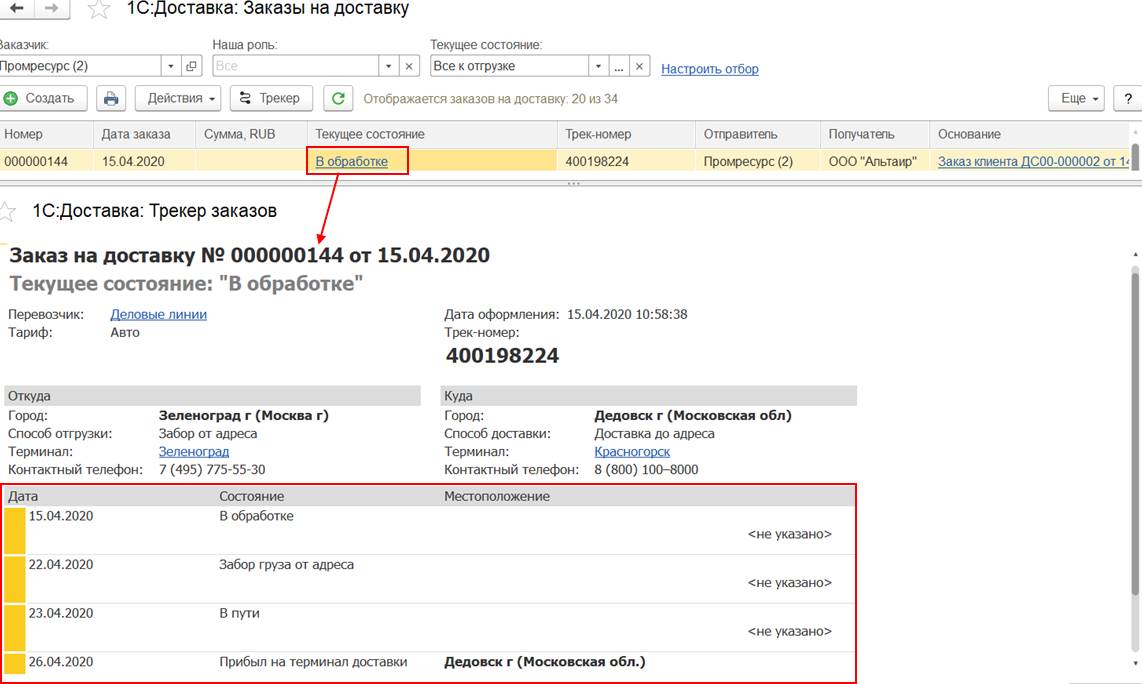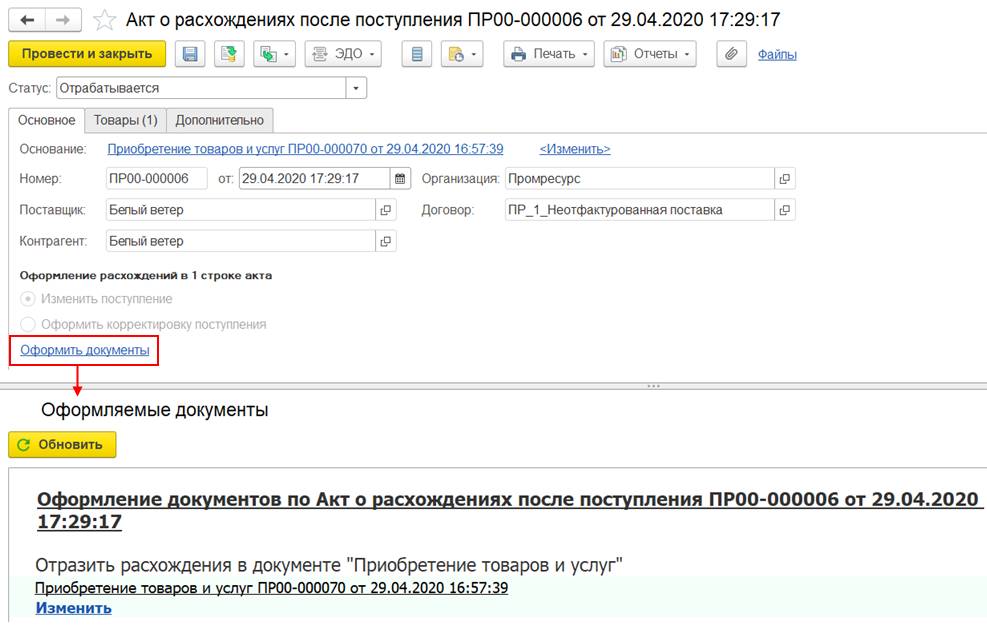 автоматически указан в качестве основания, статус изменен на Товар получен,