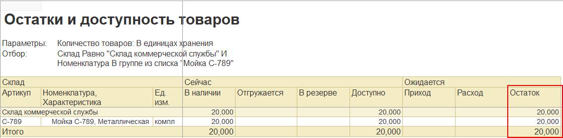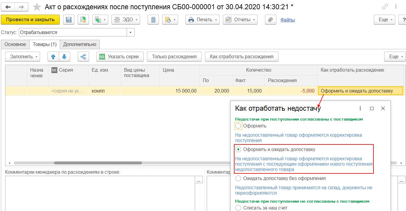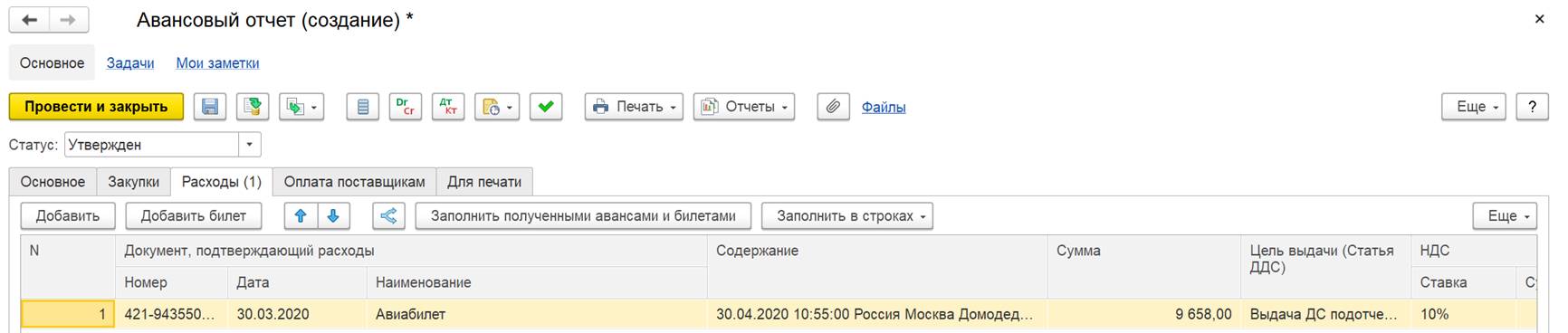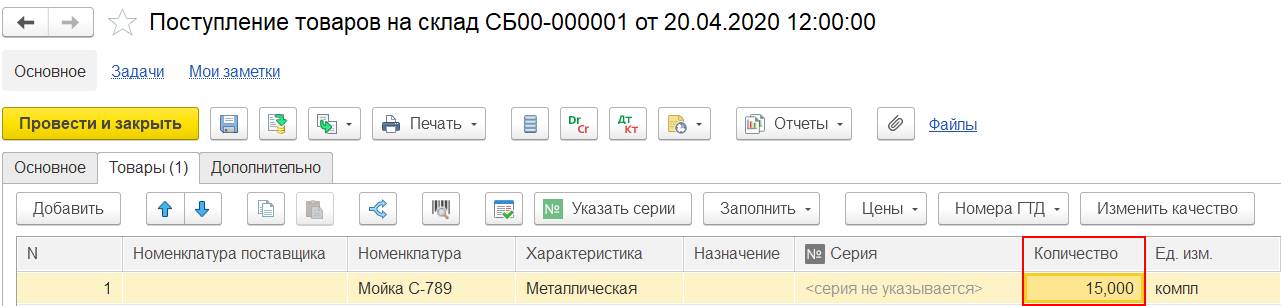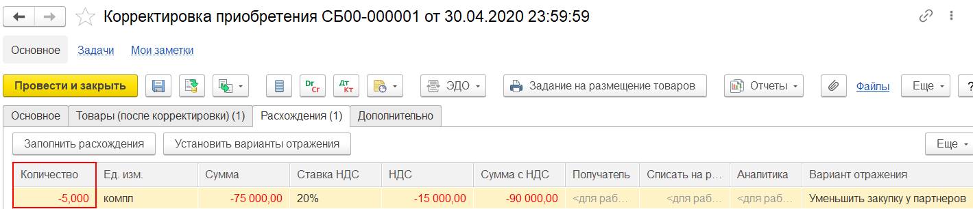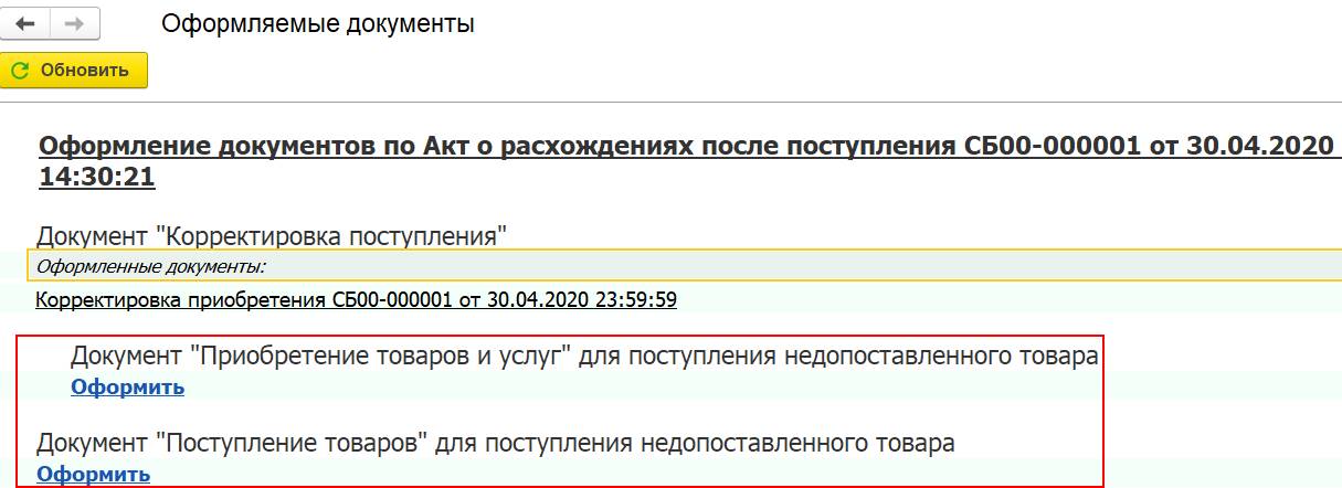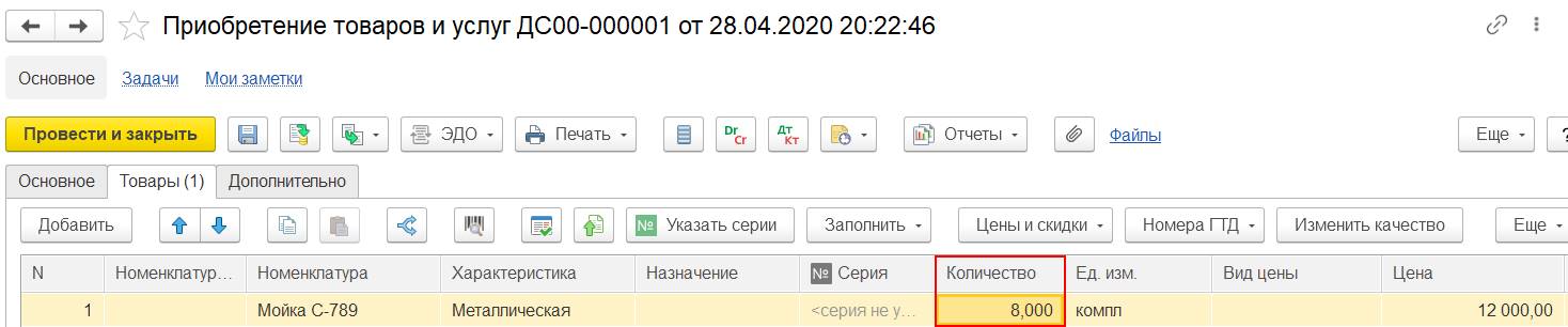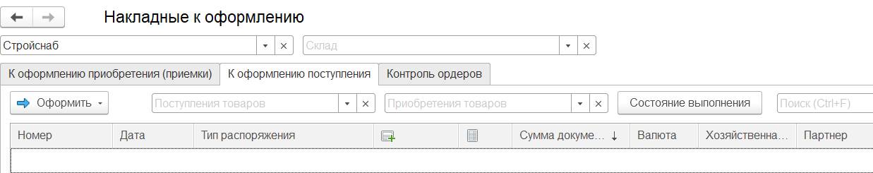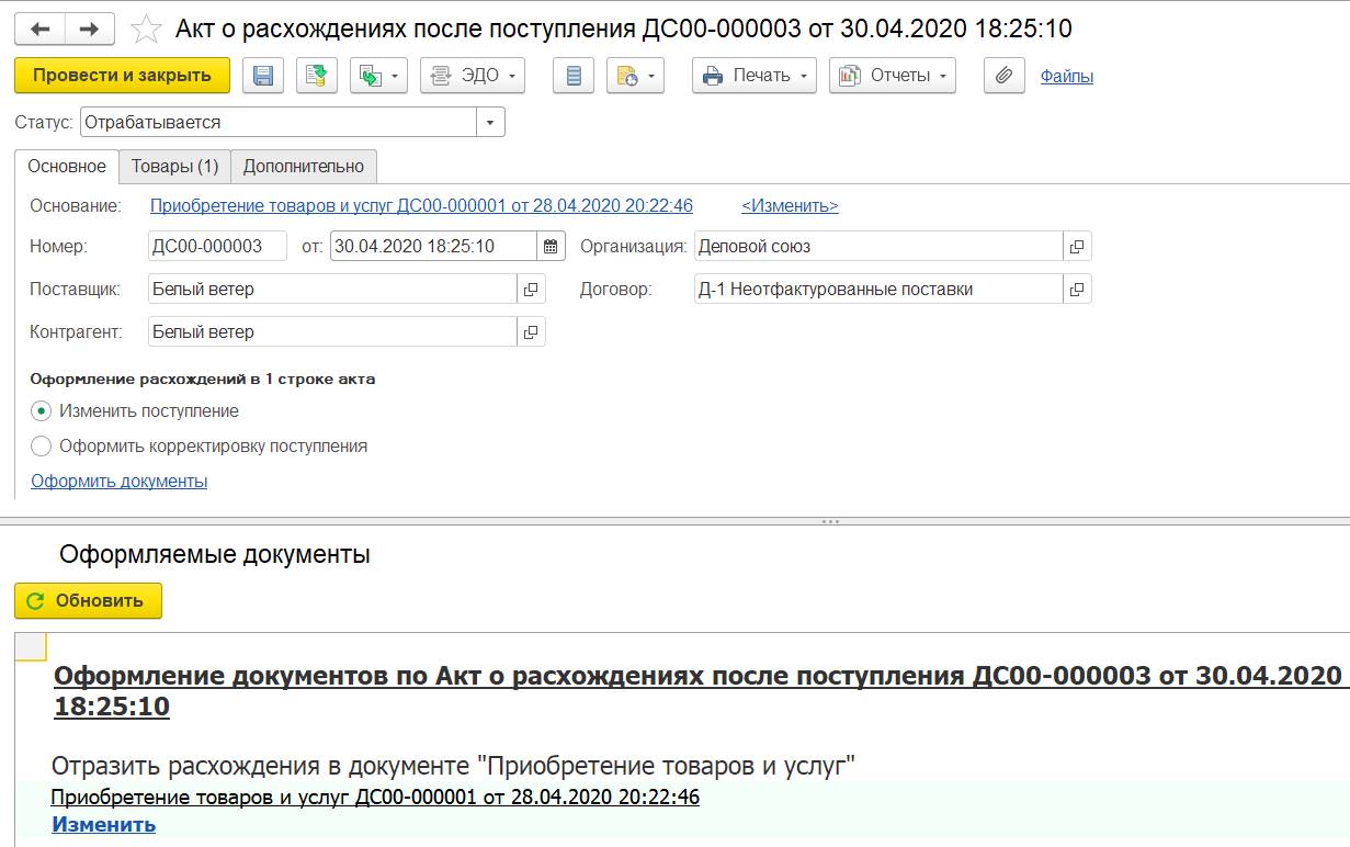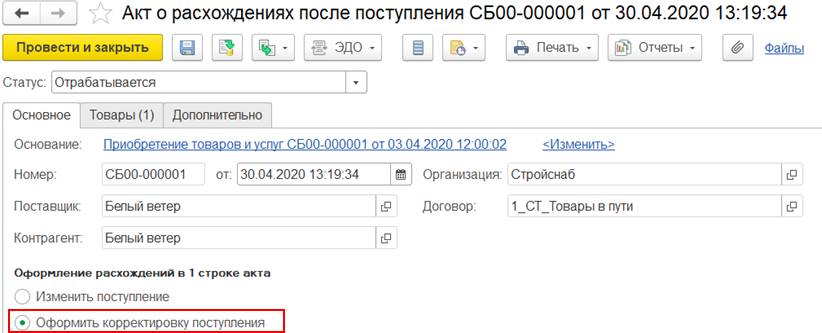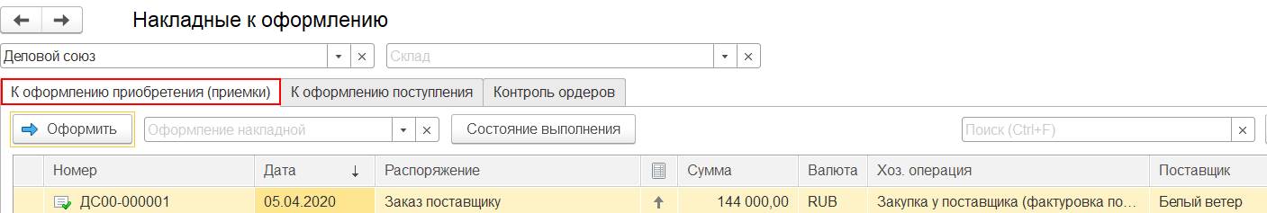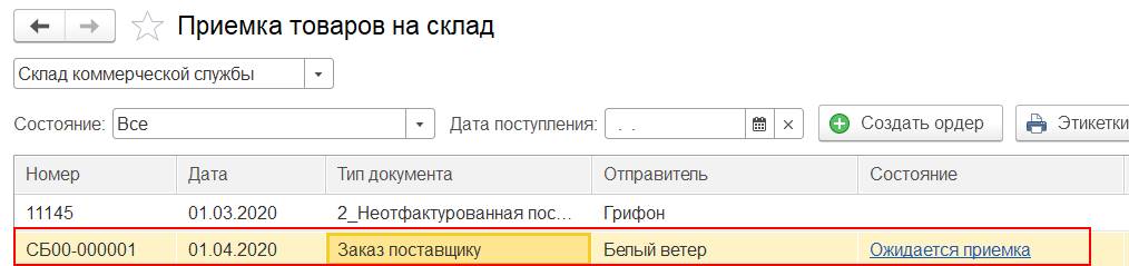 статус В пути, с выбранным документом приобретения. При этом в документе