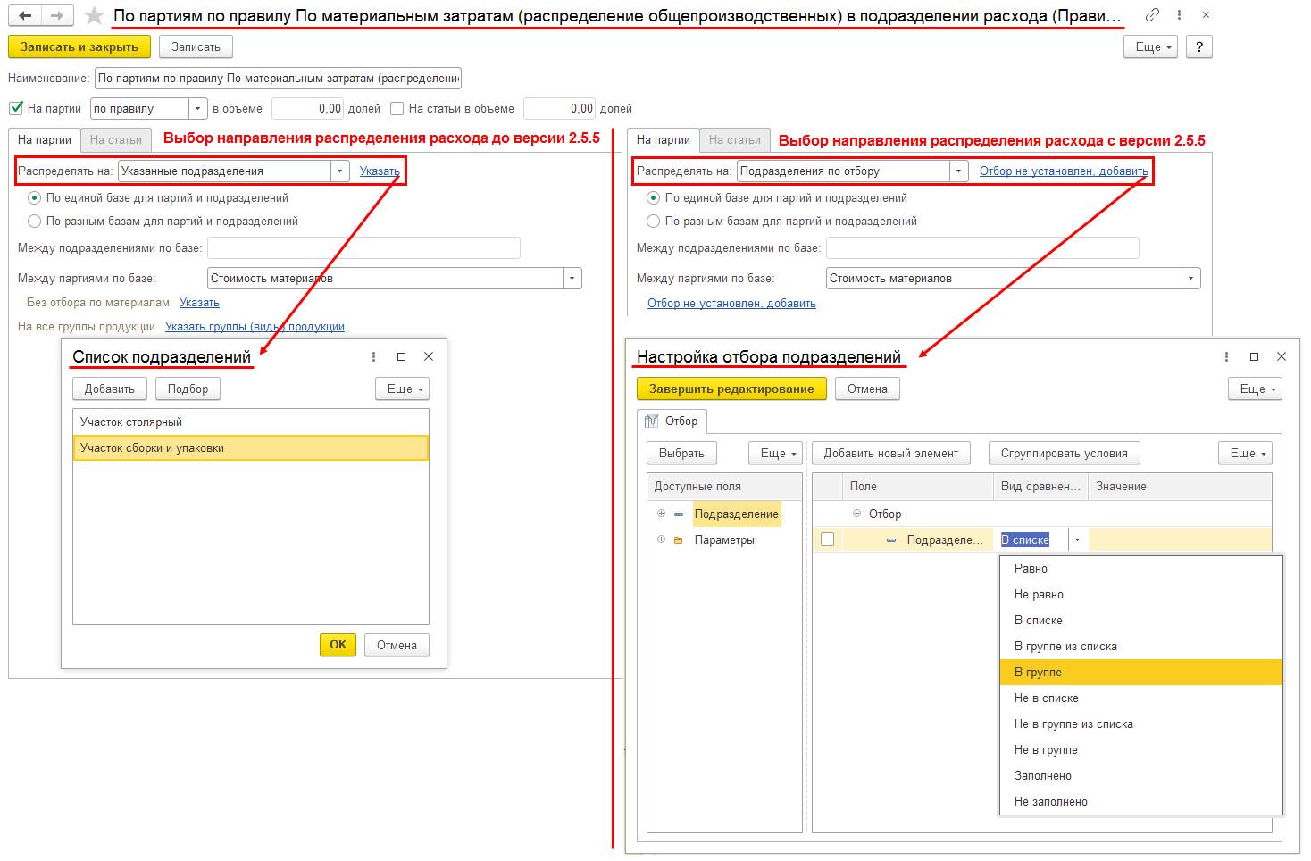 С целью повышения гибкости настроек распределения производственных расходов в прикладном решении переработана и дополнена функциональность установки отборов, используемых при настройке распределения постатейных производственных расходов. В карточках элементов списка Правила распределения и показатели и в документах Распределение расходов теперь отборы можно настроить на подразделение (направление распределения) и базу распределения по партиям не только выбором списка необходимых значений, но и наложением условий с использованием стандартных видов сравнения (Равно/Не равно, В группе/Не в группе, Заполнено/Не заполнено и пр.) Условия отбора могут быть наложены как непосредственно на значения поля, так и на его реквизиты.