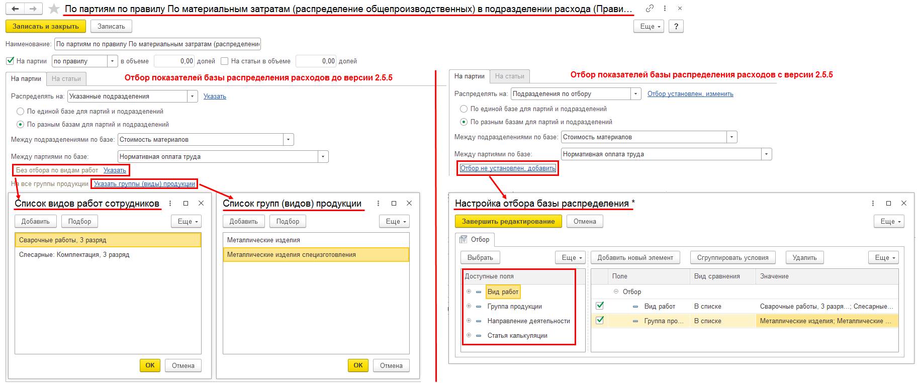 Добавлена возможность устанавливать отборы баз распределения производственных расходов между партиями: