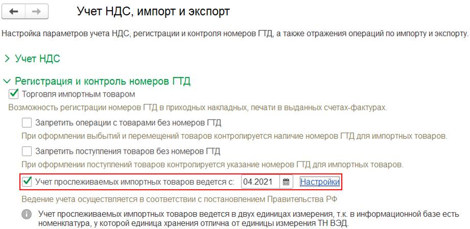 В приходных документах для товаров с прослеживаемыми кодами ТН ВЭД осуществляется контроль обязательного заполнения номеров ГТД вне зависимости от установленной опции Запретить поступления товаров без номеров ГТД (НСИ и администрирование – Настройка НСИ и разделов – Учет НДС, импорт и экспорт).