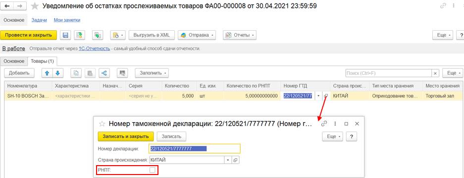 Документом уведомления об остатках прослеживаемых товаров списываются остатки с номером ГТД без признака РНПТ и приходуются остатки с номером ГТД с признаком РНПТ.