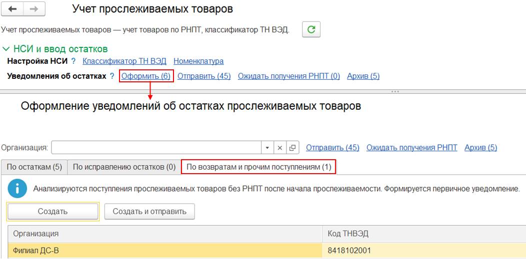 Список оформленных уведомлений об остатках прослеживаемых товаров, которые требуется отправить в ФНС, и по которым необходимо получить РНПТ, отображается в журнале документов Уведомления по прослеживаемым товарам (гиперссылка Отправить).